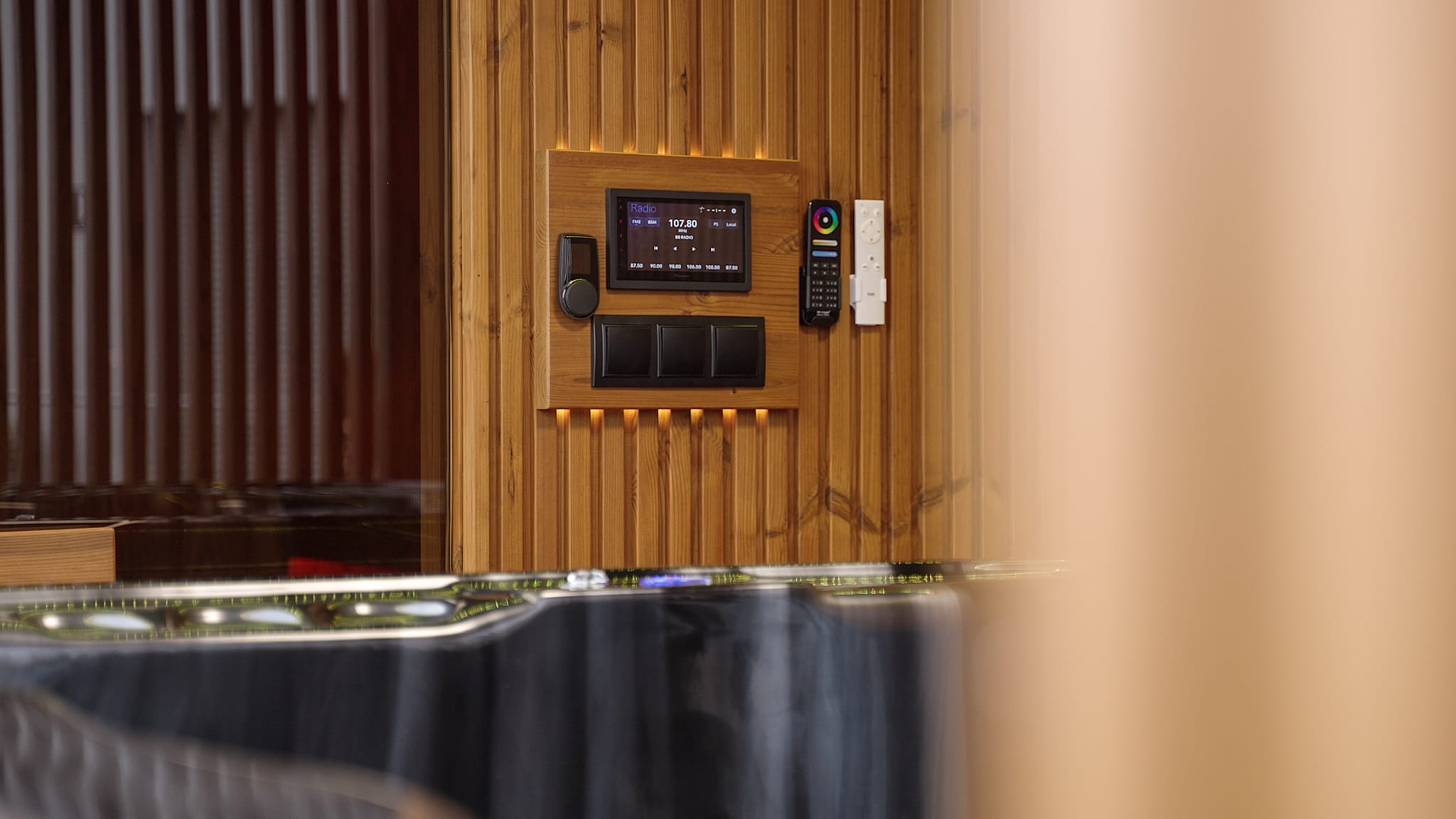 The combination of sauna + shower + jacuzzi made from a harmonious material has an aesthetically consistent and photogenic effect — perfect for social media marketing and hotel brochures.